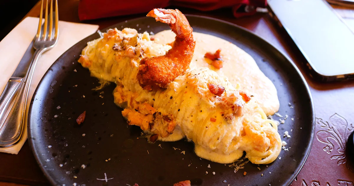 Camarão Alla Carbonara Guto da Acim, feito com espaguete, camarões, fonduta de queijo e parmesão, concorre ao festival
