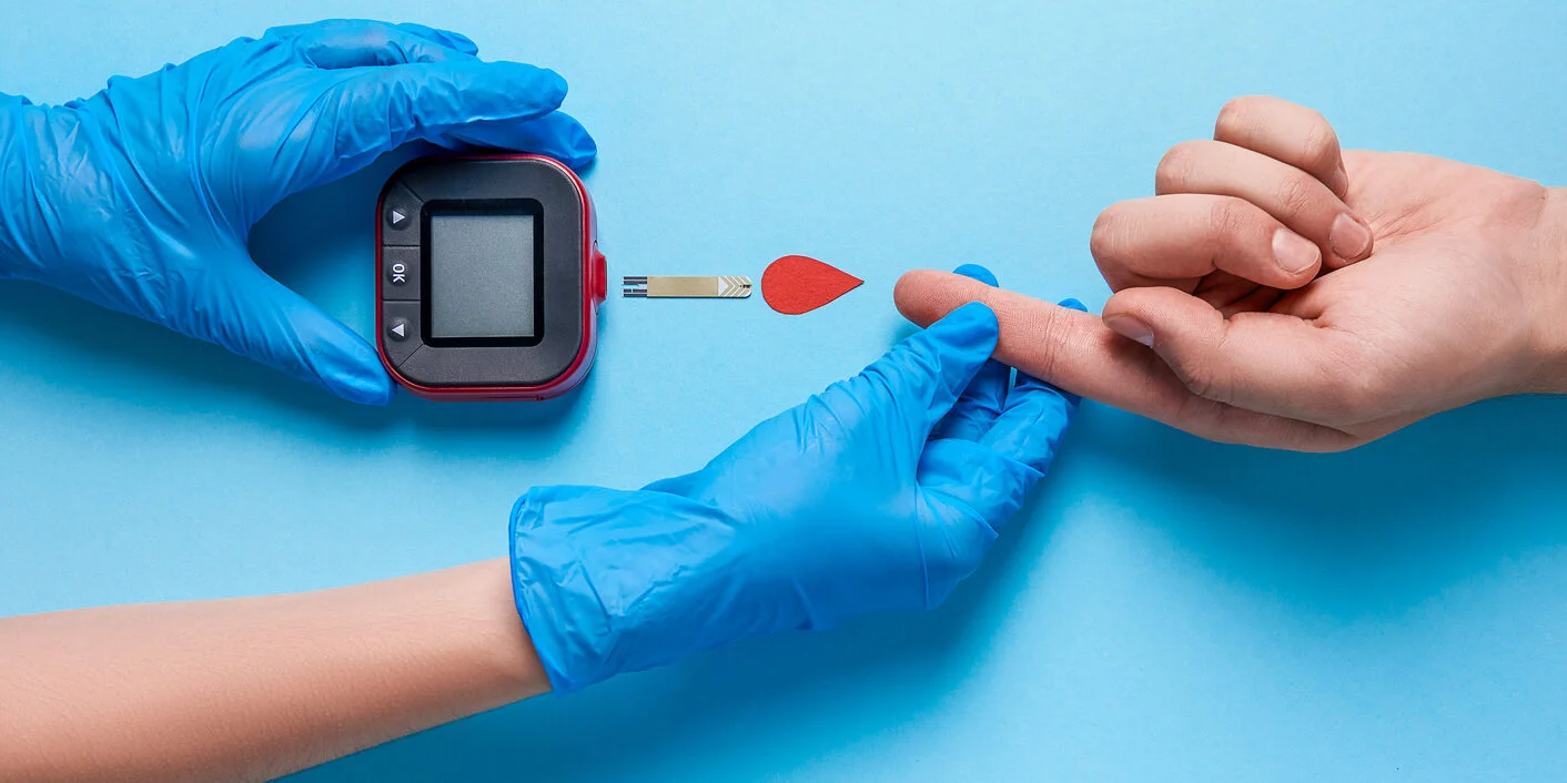 A woman draws blood on his finger and tests it for diabetes. Check high blood sugar levels with a digital blood sugar tester. Health care and medical concept