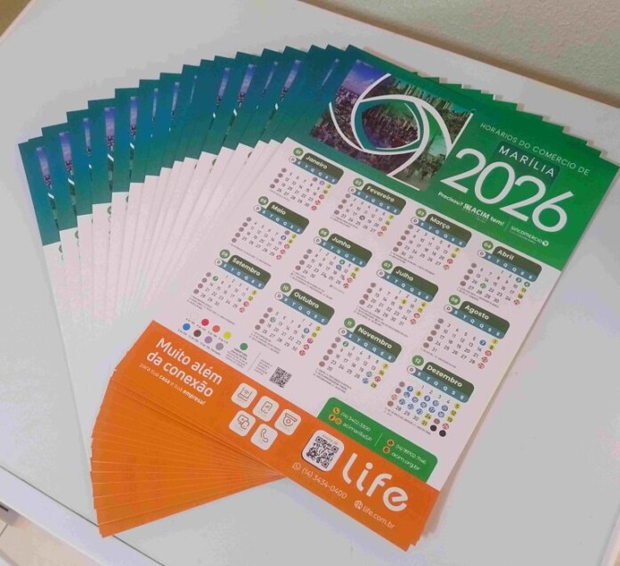 A diretoria da Associação Comercial e de Inovação de Marília já está distribuindo gratuitamente o calendário do horário de funcionamento do comércio de Marília, para o ano de 2026, respeitando a convenção coletiva de trabalho e as leis estadual e federal.