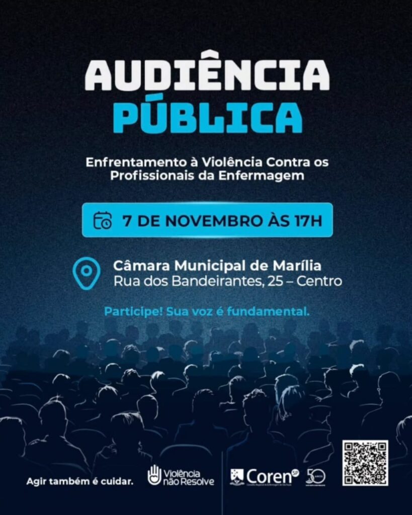 O Conselho Regional de Enfermagem de São Paulo (Coren-SP) realizará, no dia 7 de novembro de 2025, às 17h, uma Audiência Pública sobre o Enfrentamento à Violência Contra os Profissionais de Enfermagem, na Câmara Municipal de Marília. O evento é aberto ao público e tem como objetivo reunir autoridades, profissionais da saúde, representantes da sociedade civil e lideranças políticas para discutir medidas concretas de proteção e valorização da categoria.