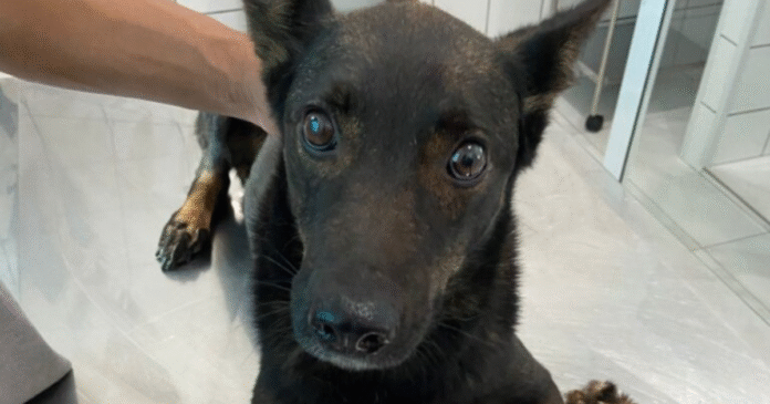 A cachorra, sem raça definida e de pelagem preta, foi retirada do local e encaminhada a atendimento veterinário. Após tratamento, deverá ser disponibilizada para adoção responsável.