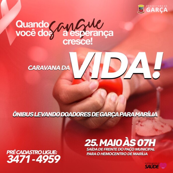 A Prefeitura, por meio da Secretária de Saúde, em parceria com o Hemonucleo de Marília, realiza mensalmente a “Caravana da Vida“, uma ação solidária e voluntária de doação de sangue. O objetivo é ajudar o banco de sangue, que atende as cidades de nossa região, a manterem seus estoques. A ação convida aos interessados em fazer a doação de sangue, disponibilizando uma vez por mês, sempre aos sábados, um ônibus que sai às 7h de frente do Paço Municipal. Em maio, a ação acontece dia 25.