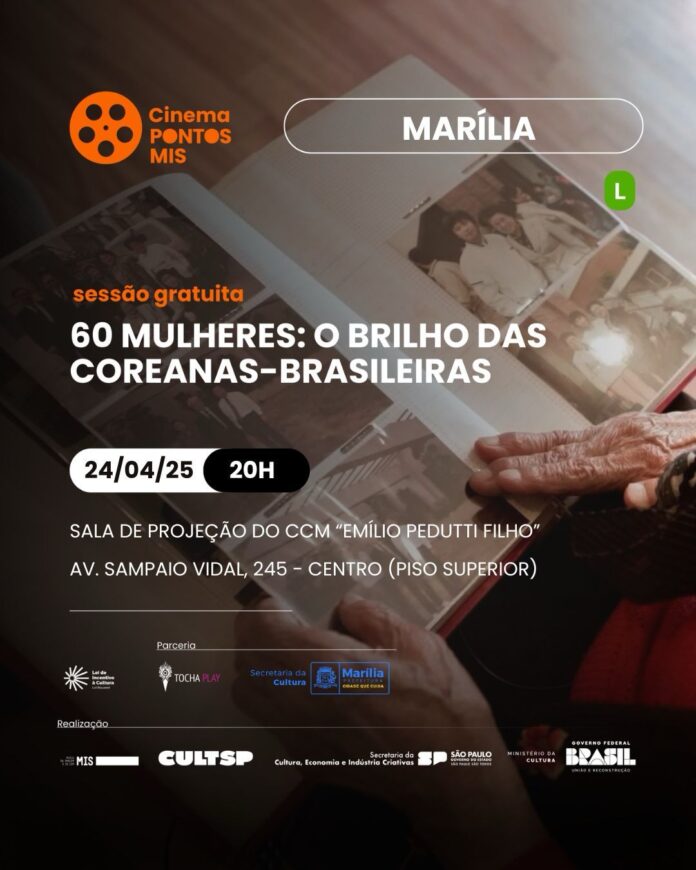 A Secretaria da Cultura de Marília, em parceria com Museu da Imagem e do Som – Pontos MIS, realizará nesta quinta (24), 20h, a exibição do documentário “60 MULHERES: O BRILHO DAS COREANAS-BRASILEIRAS”, uma obra sensível e inspiradora que celebra a força, a trajetória e a identidade de mulheres coreanas que encontraram no Brasil um novo lar.