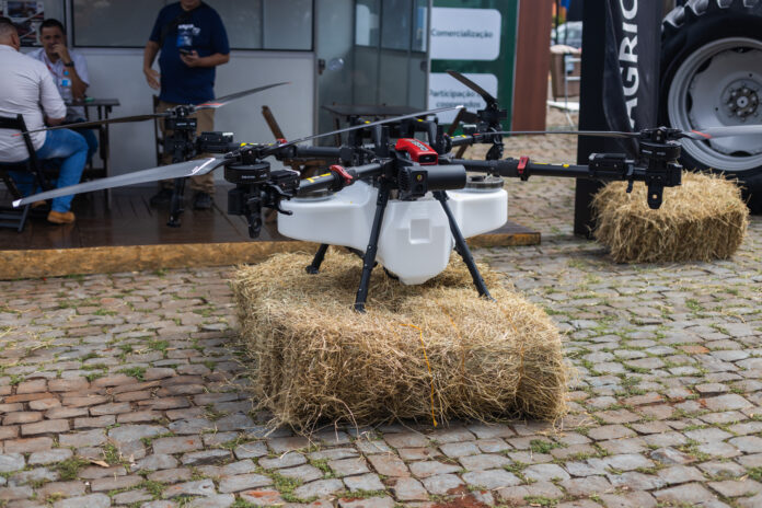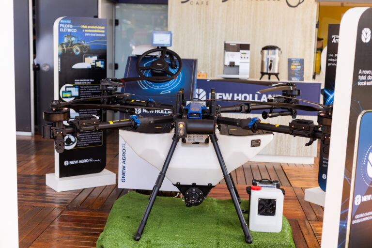 Já a New Holland e a Case IH, marcas do grupo CNH, expõem o modelo XAG P150. Com capacidade para 70 litros, o drone é distribuído pela própria New Holland e se destaca pelo seu sistema de voo com duas baterias, que oferece redundância e maior segurança. “Ele faz tanto a pulverização como a dispersão de sólidos.