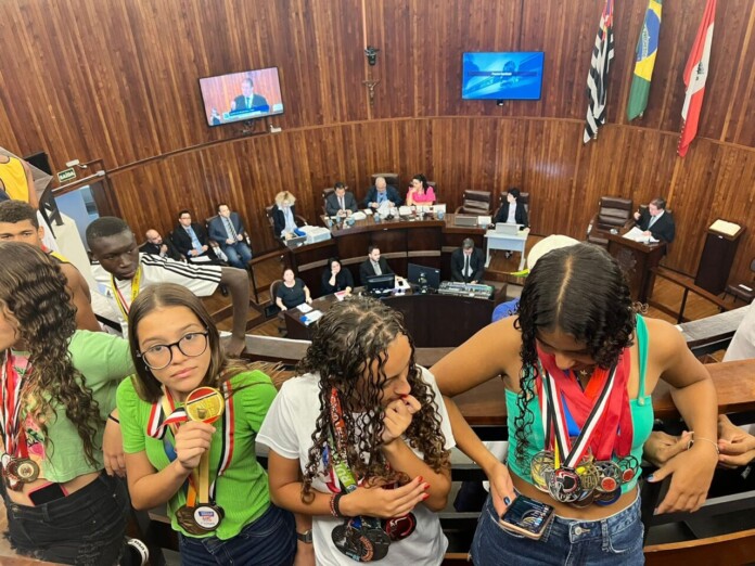 Jovens medalhistas de várias modalidades ocuparam as galerias e viraram de costas durante discurso de alguns vereadores de situação.