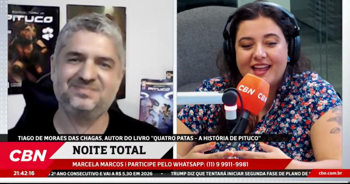 Tiago de Moraes das Chagas conversou com Marcela Marcos no jornalístico ‘CBN Noite Total’ nesta 2ª-feira, 29 de dezembro, sobre o livro ‘Quatro Patas, a história de Pituco’