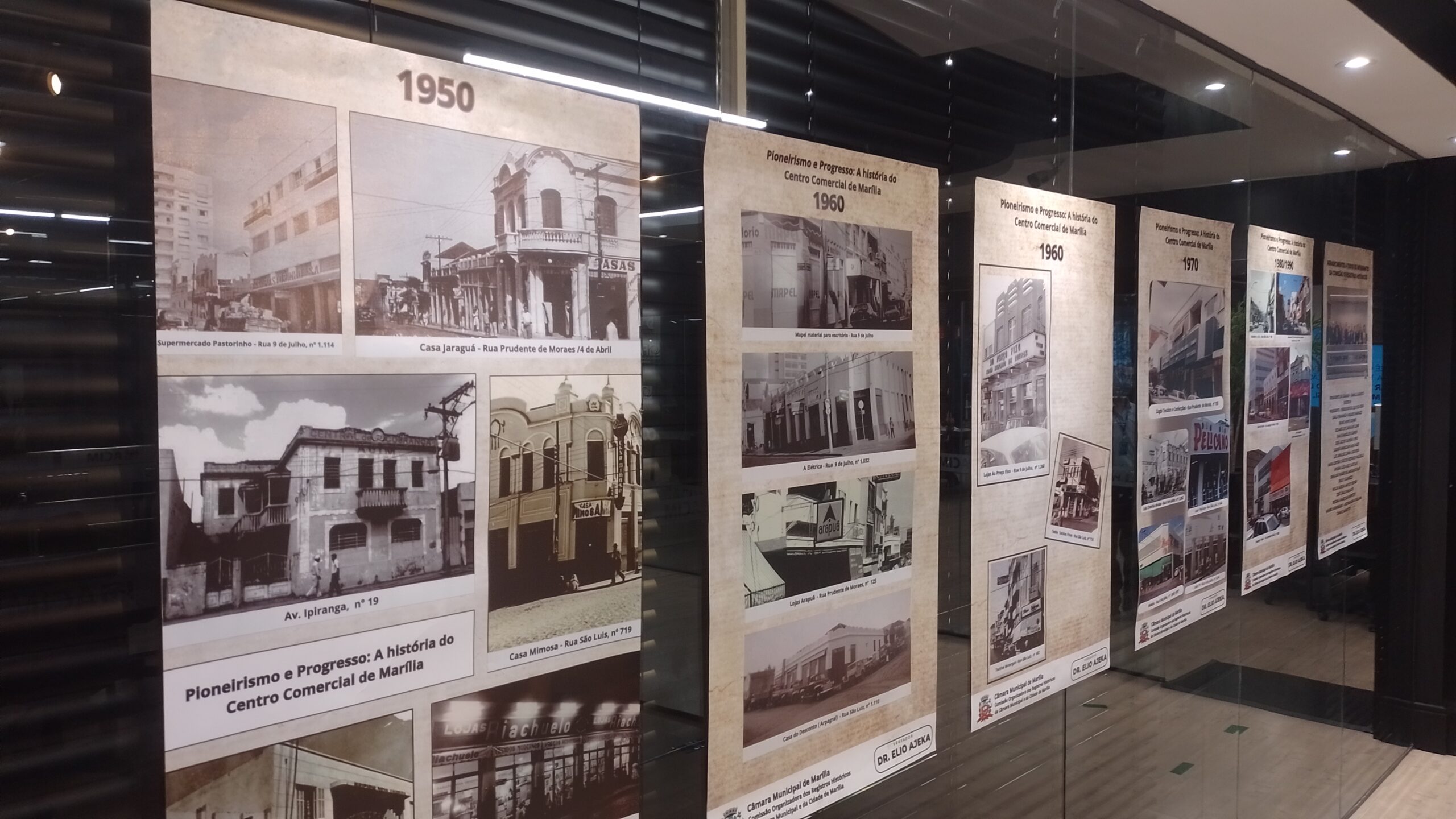 Desde o início desta semana todas as pessoas que adentrarem na sede da Associação Comercial e de Inovação de Marília terão a oportunidade de vislumbrar alguns registros fotográficos do centro comercial da cidade, no período de 1940 até o ano de 1990, através de nove painéis que estão colocados no corredor principal de atendimento ao público. Uma iniciativa da Comissão Organizadora dos Registros Históricos da Câmara Municipal e da Cidade de Marília. “Nos sentimos honrados com esta exposição que registra de forma carinhosa alguns ícones do nosso comércio e que vem atraindo muitas pessoas, que passam a recordar daquela época ao verem prédios do centro comercial de Marília e lojas que marcaram época”, disse o presidente da entidade, Carlos Francisco Bitencourt Jorge ao agradecer a Câmara Municipal de Marília, através do vereador Dr. Elio Ajeka, atual presidente da comissão dos registros históricos.