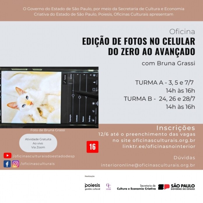 Um dos projetos é a Oficina Edição de Fotos no Celular – do Zero ao Avançado, que será ministrada por Bruna Grassi, em duas turmas, com duas aulas cada turma, que serão de forma online, transmitidas via plataforma Zoom.