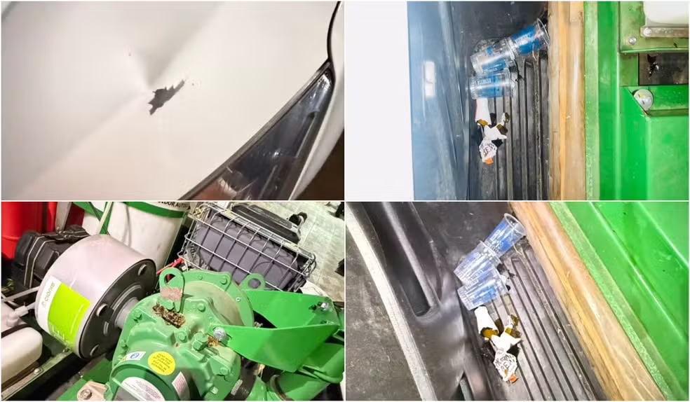 De acordo com o boletim de ocorrência, além de atingir a carroceria do veículo, o suspeito também lançou a garrafa contra o equipamento de pulverização de inseticida. A ação foi registrada como dano ao patrimônio público.