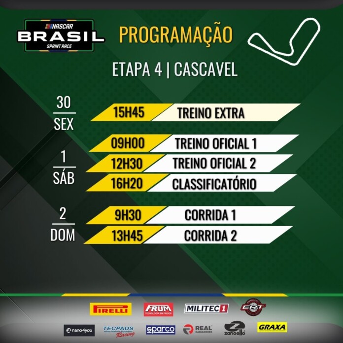 A primeira corrida será domingo, 02 de julho, às 9h35, enquanto a corrida 2 terá largada a partir das 13h45. Na sexta-feira, 30 de junho, os pilotos entram na pista para um treino extra às 15h45. No sábado, acontecem dois treinos livres oficiais às 09 horas e 12h30. Os dois treinos classificatórios que definem os grids de largada no traçado misto da pista paranaense estão programados para a tarde do sábado a partir das 17 horas com transmissão ao vivo no Youtube da @NASCARBrasil.