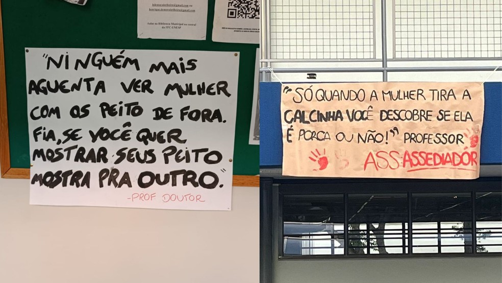 Cartazes com denúncia de assédio sexual e moral colados nos campus da Unesp de Marília — Foto: Arquivo Pessoal