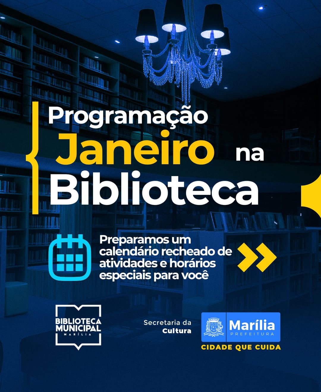A Prefeitura de Marília, por meio da Secretaria da Cultura, divulga a programação cultural do mês de janeiro, com uma agenda diversificada de atividades gratuitas voltadas a crianças, jovens e adultos. As ações acontecem na Biblioteca Municipal e contemplam exposições, oficinas, contações de histórias, eventos literários, clubes de leitura e programas permanentes.
