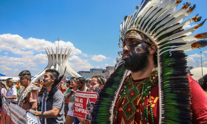 Para acompanhar o julgamento no STF, indígenas estão mobilizados em Brasília. Eles também se manifestam contra a tentativa do Senado de legalizar o marco temporal.