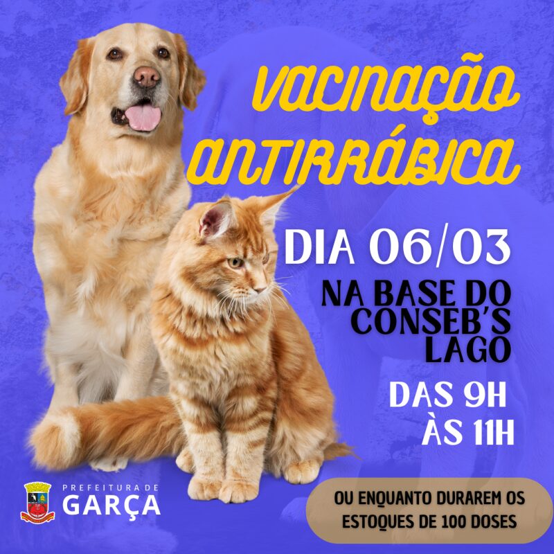 A Prefeitura Municipal de Garça, por meio da Secretaria Municipal de Saúde, fará a aplicação da vacinação antirrábica em cães e gatos na quarta, dia 6 de março, na Base do Conseb´s (embaixo da base da Polícia Militar na região do Lago Artificial J. K. Williams), das 9h até às 11h ou enquanto durarem o estoque de 100 doses de vacinas que foram enviadas para essa ação no município. Importante salientar que em caso de chuva não haverá vacinação, por conta de se tratar de um espaço aberto.